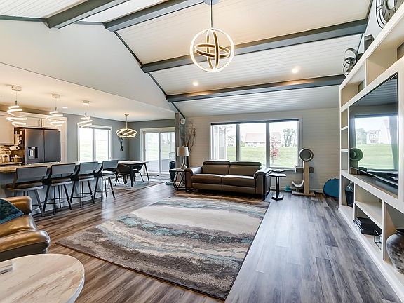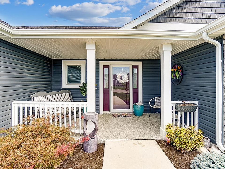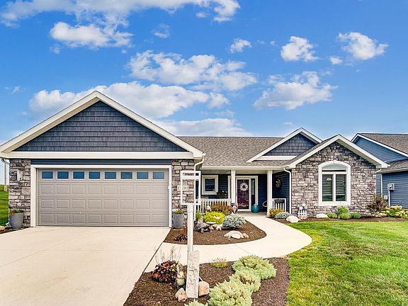 Maintenance free living with clubhouse and pool amenities, minutes from shopping and connected to The Trails. Built in 2019, this up-to-date 3 bedroom, 2 full bath ranch is situated at the end of a cul-de-sac with upgrades throughout including quartz in kitchen and bathrooms, a 2+ car garage (with epoxy floor), epoxy flooring on outdoor patio and screened in porch, custom blinds throughout, 2x6 wall construction and custom details throughout like cathedral ceilings in the great room with beams and shiplap. Don't miss your chance to see this spacious villa! Villa association fees are $185/month and include snow removal, mowing and clubhouse use and access. Sale includes garage and kitchen refrigerator, range, microwave, dishwasher, washer and dryer, water softener (owned), TV mounts, blinds, garage door opener.