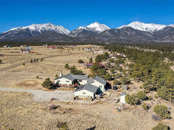 Whether relaxing in the Springtime courtyard with hundreds of blooming Columbines, sitting on the wrap-around deck enjoying the rare 360-degree view of the mountains, or taking a well-deserved soak in the hot tub while gazing at Mt Princeton, this home truly elevates you into authentic mountain living! Located in one of Chaffee County's premier neighborhoods, Mesa Antero is a neighborhood that has it all; access to Browns Creek Trail, BLM, vibrant neighborhood groups (if you desire), and even its own private park for residents - Stew Brown Park. This rare Mesa Antero subdivision home features 2.56 acres of wooded and mesa property and is ideally situated to captivate with Panoramic mountain views from every room in the house. The home enjoys two wood stoves, a fenced backyard, and its kitchen is central to the heart of the home. On the eco-friendly side, the home uses private community water and has a greenhouse and planter box area. The home also sports a roof-top solar generation, allowing no power bills for 6+ months of the year and keeping the net average power bill below $140 per month. The newest addition features a fabulous primary suite with a wood-burning stove and vaulted ceilings adjacent to the vast 3/4 bath ensuite with Jack and Jill doors. On the other side, you will find a 4th bedroom/study with vaulted ceilings and views that overlook the northern mountain ranges. On the opposite side of the house, there is an additional bedroom with an ensuite bath, another bedroom, and a full bath with a jacuzzi tub. Finally, there is a large laundry room with a full closet which could be used as a 5th bedroom if desired. The mountain view sunrises and sunsets seen from this home are genuinely Magical and must be seen to be appreciated!