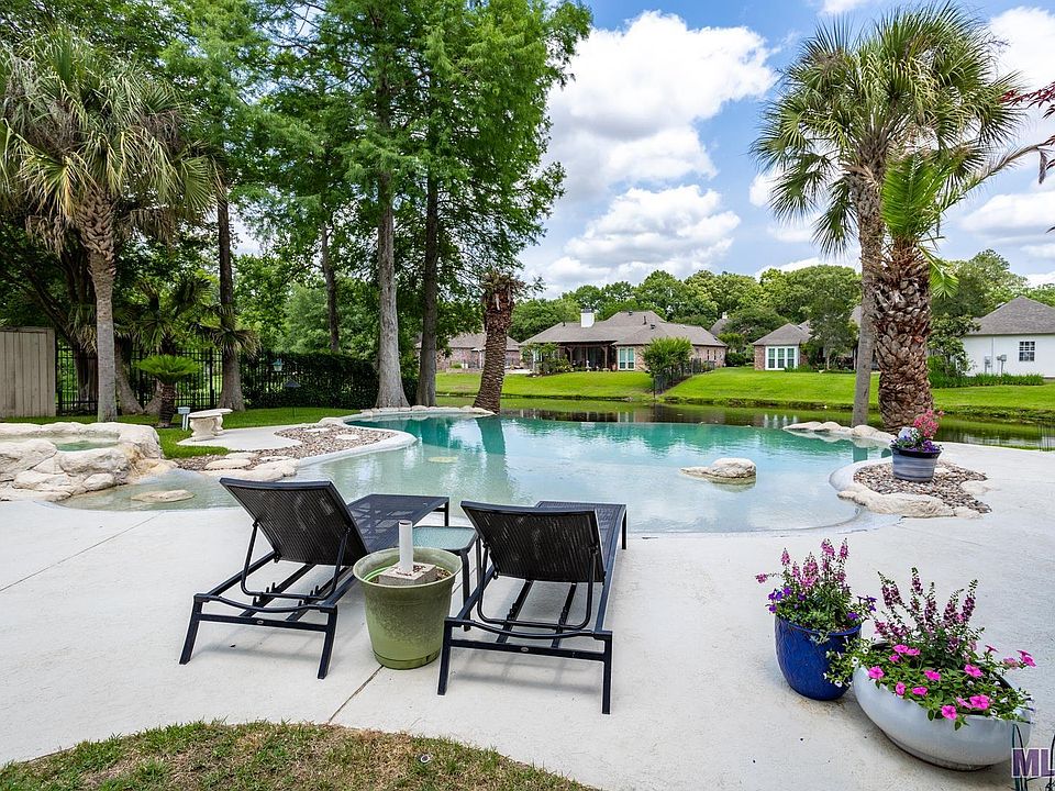 Gorgeous Home tucked inside a cul-de-sac on a corner lot in Highland Trace subdivision situated off historic Highland rd. located in Baton Rouge Louisiana Over 3,000 sq ft with a triple split floor plan! Through the foyer you will enter the formal dining room featuring original 4-inch oak wood floors with a large window. The kitchen offers custom cabinetry, Monogram appliances, 5 burner gas cooktop, center island, and wet bar with Wine fridge, & a Ice maker. Off the kitchen sits a keeping room with built in shelving and gas fireplace. The primary suite features a wood accented wall, plus sitting area with the best views in the house. The bathroom includes dual vanities, free standing soaking tub, custom tiled shower, & beamed cathedral ceiling. Through the living room french doors you will find breathtaking views of the backyard featuring a heated saltwater infinity edge pool and spa on the lake. This home also includes a whole house generator, surround sound, and a 2-car garage plus a third bay.