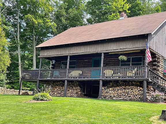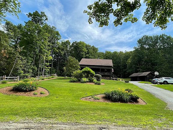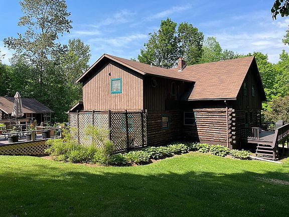 A log cape style single family 2 floor home. Featuring 2200 sq ft of living space on 2.5 acres of combined well groomed lawn and woods. Exterior is log sided. First floor has large full kitchen dining room and large living room with beautiful VT Casting Wood stove connected to a brick mantle with built in wood storage. First floor also has comfortable TV/Sitting/Reading/Family area that connects through newly installed atrium doors to an outside 2-tired deck. 1st floor flooring is wood, slate and tile. Second floor has 4 bedrooms and 2 newly remodeled bathrooms. Upstairs flooring is all newly installed wood laminate. All bedrooms have large closet space. Master bedroom has a walk-in closet. Basement is divided into 2 sections. Larger section is fully finished with gym/recreation area. It also features a small wood stove on a brick hearth. This area also has a separate laundry room. 2nd section is separated by a door passageway and is used for storage and utilities. Home also has a wraparound covered porch with stairs to the backyard. Property is attractively landscaped.