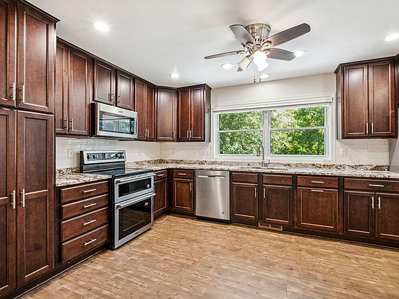 Walkout Rambler on private .83 acre wooded lot. Lot extends far back into the trees for privacy. Completely renovated and updated. 3 bedrooms on the main level. Open floorplan. Kitchen with solid surface counters, stainless appliances, breakfast bar, recessed lighting, soft close cabinetry, & LVP floors. Great room with lots of windows and gas fireplace. Informal dining. Sunroom walks out to composite deck overlooking wooded back yard. Main floor laundry. Main floor bath with tile floors and tub surround. Walk out lower level includes 4th bedroom, full bath, Family room w/ gas fireplace, rec room, amusement room, mechanical room w/ storage. Safe room in lower level for valuables is 12ft x 7ft. Newer mechanicals & roof. Concrete driveway. Private & Conveniently located near parks.