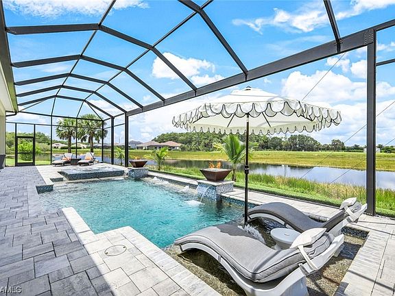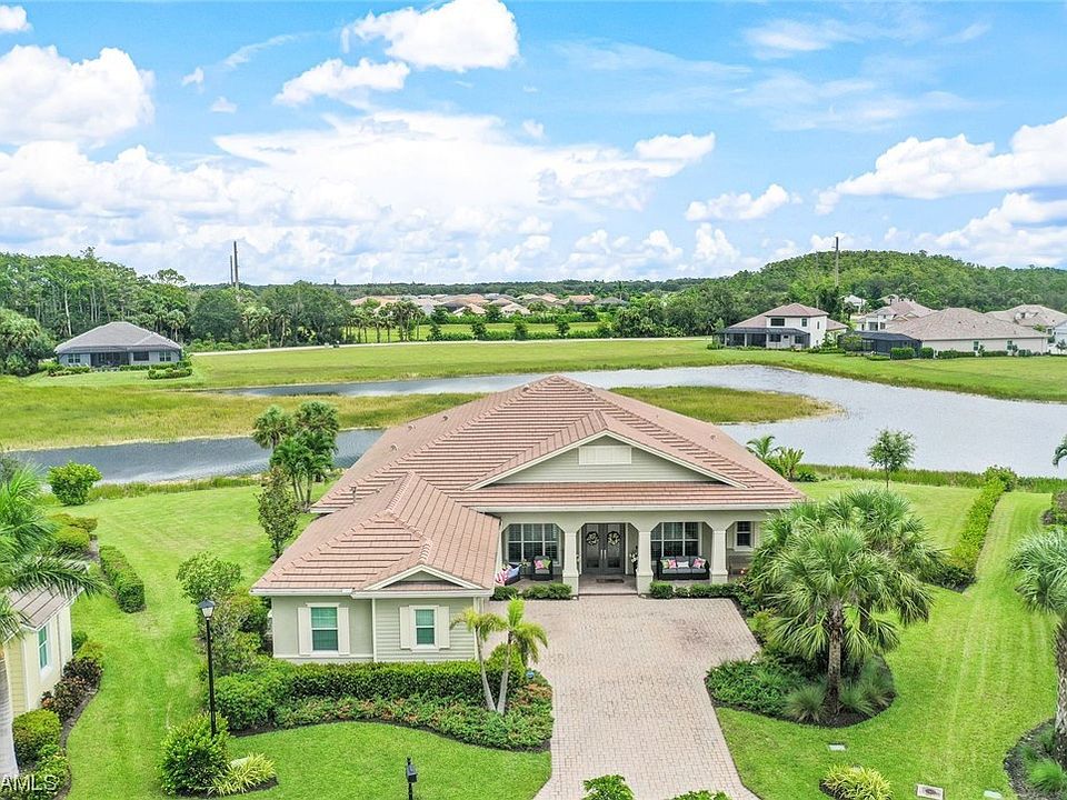 Step into a world of unparalleled luxury, where every sunrise and sunset paints a masterpiece across 214 ft of breathtaking waterfront views. Boasting 4 spacious bedrooms, a den, and 5 bathrooms, 3 full & 2 guest (including a pool bath), this residence screams grandeur. Each room shines with touches of opulence - from the exquisite glass tile floor inlays that mirror majestic tray ceilings, to the sleek quartz countertops complemented by a shimmering mother of pearl backsplash and Nautilus Shell inlays. Step outside, and you're greeted by a mesmerizing PebbleTec-surfaced custom pool, illuminated with fire bowl flames & colorful LED lights. That's not all! Upgrades include: all impact windows and doors, whole-house generator, coffered ceilings, saltwater pool system, central vacuum, luxury built-in Monogram refrigerator, and Sonos sound system. Nestled in an elite community with golf courses designed by Jack Nicklaus and Bob Cupp, Tennis Courts, Full Service Spa, Fitness Center, Pickleball, Nature Trails, Resort Style Pool, Full-Service Dining, Dance Floor, and more!