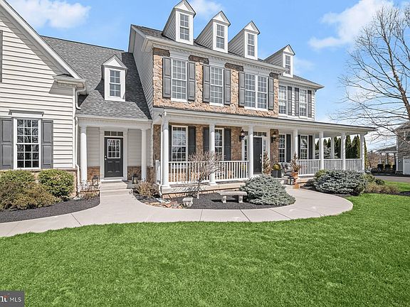 The one you've been waiting for is here in Cloverfield. Catonsville Builders quality construction and attention to detail encompass the beauty in this lovely home originally was to serve as a model, now offered by the original owner. Partial wrap front porch entry framed by stone accents, offers a peaceful view of the surrounding homes and landscape. Two story foyer will impress all who enter, flanked by formal DR and LR you will immediately notice the substantial mouldings, arched transitions, over-sized base and window trim. LR a perfect setting for cozy conversation. Formal DR with tray ceiling highlighting significant chandelier leading to beverage bar and cabinetry onto an amazing kitchen. An abundance of Homecrest custom cabinetry with contrasting perimeter and island finishes. The breakfast bar joins the large sun room with commanding views of the rear private, level yard. Marble farm sink, granite counters, Bosch dishwasher, over-sized island with storage on both sides, meal sized Wolfe microwave drawer and desk nook, Wolfe gas range with burners, griddle and oven, stainless exposed vented range hood with variable lighting and fan speeds. Counter depth Subzero double door column installation of separate refrigerator and freezer. Walk-in pantry. The kitchen opens to the FR with stone framed gas fireplace, impressive mantle; substantial coffered ceiling anchors a unique wall art framed application. Formal library with French doors and transom. Rear split stair to upper-level private spaces. Primary bedroom suite with tray ceiling, sitting room, walk-in closet room, bath with separate vanities, soaking tub, over-sized dual shower with seating. Additional bedroom with ensuite bath and walk-in closet, two bedrooms with shared bath, large upstairs family room that can easily serve as play space, desk space, guest quarters or fifth bedroom. Full sized laundry room with additional service sink and work space for clothing care. 3-car garage interior access along with front covered porch access to the main level mud room, complete with service sink and cabinetry, foot lockers, personal cubbies and large family closet. The lower-level offers walk-out access to the rear yard. Ample finished space is ready for your favorite games or entertainment center, full bath and rough-in for future wet bar. The storage room is vast. Over all improvements include Hand Hewn 8-inch planked Hickory flooring throughout the main level, impressive up-graded lighting throughout, over-sized windows, Trex decking, stone patio. Easy access to Rt. 32 and 144; neighborhood is only accessed by formal entrance. This could be your new address.