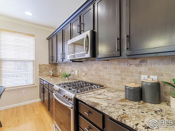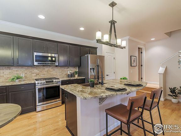 Urban living in Vantage Point that sits on the border of Louisville. Natural light floods through the numerous windows in this beautifully appointed 3 bedroom, 3 bath end-unit townhome that has many upgrades including: 3 car tandem garage with additional finished room, upgraded kitchen gas range/oven, large kitchen island with slab granite countertops, chef's kitchen with pantry, beautiful stone 3-sided gas fireplace, gorgeous primary bath with x-large shower & 2 shower heads, solid hardwood floors throughout the main level and up the stairs, new carpet in bedrooms, all stainless steel appliances included along with the washer/dryer. HOA amenities include pool, hot tub, exercise room & clubhouse that can be reserved for private events, business center, dog park, recreation area as well as water, trash, snow removal, hazard insurance & exterior maintenance included in HOA fee. Boulder Valley schools. Easy proximity to Denver, Boulder, DIA, Interlocken Business Park, Flatiron's Mall, public transportation (the A/B Bus line stop is located in the community with NON-STOP service all the way to the Denver International Airport!) , restaurants & shopping. Convenient access to miles of open space trails and the US 36 bike trail.