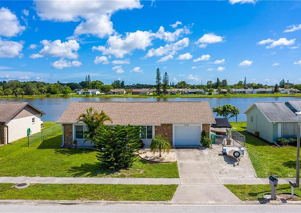 Rarely available Lakefront residence in the Gardens of Gulf Cove. It has 2 bedrooms, 1 bathroom with newer toilet and sink. There is a inside laundry room with a stall shower and double sink. Enjoy the open feeling with the Cathedral ceiling in the living room, dining area and kitchen. Home has block construction and roof was replaced in December of 2017. New upgraded electrical panel scheduled to be installed. Home has newer impact windows, new front door and garage door. Garage door has an electric opener and garage has a door to the rear yard. Enjoy the views from the tiled screened lanai overlooking the lake or go get some sun on the outside block patio. The lanai was just re-screened. There is even extra parking on side of home for your boat or RV plus the driveway has been widen for extra car parking. The yard is partially fenced. Home is move in ready and the owners would like to leave all the furniture. You can start using your dream house right away. Located in the well kept community of the Gardens of Gulf Cove where there are almost 900 homes, 4 lakes, underground utilities, sidewalks, street lights, county water and sewer. The low yearly fee in this deed restricted community is only $365.00 a year, yes a year and includes 2 community pools (1 heated), tennis courts, shuffleboard, bocce play, basketball court, rec. center, exercise equipment, full time manager, pool tables and a friendly atmosphere. The area beaches are located about 15 minutes away on Manasota key in Englewood or on Boca Grande island. There is just so much to do in our area and home prices are so reasonable. If you don't know our area some do call it one of the world best kept secrets. Plenty of convenient shopping, dining and entertainment only minutes away. County owned 9 mile blacktop Bicycle and walking/jogging trail less then 1 mile away. Make your appointment today to see this beautiful well kept home. Welcome to paradise!