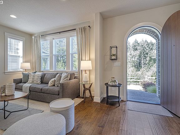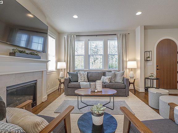 Experience the best of Pacific Northwest living in this meticulously maintained Tudor-style home located in the desirable River Terrace master-planned community. Enjoy stunning treed views and a serene atmosphere, creating the feeling of living in a vacation home. This elegant English-style residence features an open floor plan with tall ceilings, hardwood floors, and a cozy gas fireplace. The spacious kitchen is a chef's delight, boasting a HUGE granite island, quartz countertops, a gas range, and stainless-steel appliances. The primary suite offers vaulted ceilings, captivating views, a walk-in closet, and a luxurious bathroom with a walk-in shower and dual vanity. A dedicated tech area is perfect for your home office needs. Embrace sustainable living with state-of-the-art 11.6 kw solar panels, providing eco-friendly energy solutions. Additional highlights include custom blinds, a two-car garage with built-in storage, high-efficiency furnace, and central air conditioning. The low-maintenance fenced yard and patio are ideal for summer BBQs. Take advantage of community amenities, including front landscaping, access to natural spaces, a pool, playground, gym, and common areas. Located in River Terrace WEST, with Beaverton Schools, this remarkable home offers the perfect blend of elegance, functionality, and energy efficiency in one of the best neighborhoods in the area. Don't miss the opportunity to call this stunning property home!