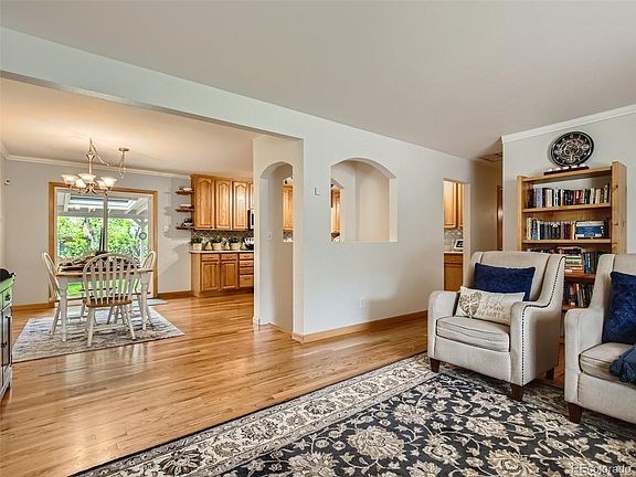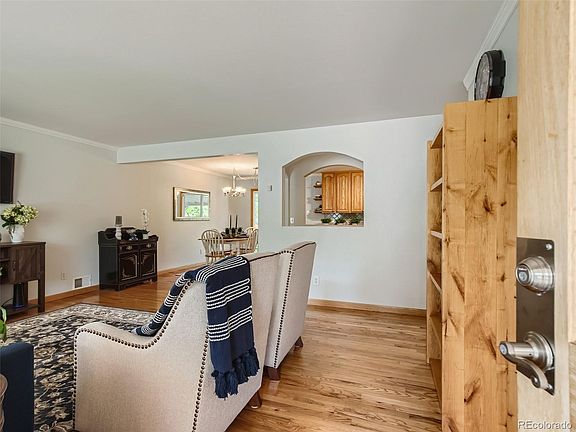 This Ranch home is nestled in the charming neighborhood of Applewood West! Upon pulling up to the home you will want to sit on the covered front porch and enjoy the neighborhood. For those of you who need RV, trailer or work truck parking off street this home can accommodate. Open the front door and enjoy the natural light, hardwood floors all through the main level (bathrooms have updated tile) and open floor plan. Kitchen has granite countertops with beautiful backsplash, stainless steel appliances, 42" cabinets and coffee bar area. Full bath on main level has been updated. Primary Bedroom on main level has updated ensuite 3/4 bath. There are three bedrooms on the main level. The lower level bath has had a complete remodel with a walk-in shower and floating vanity. The large Family room w/ egress window is perfect for gatherings. There are 2 additional bedrooms in the basement level (one of which is non-conforming and can be used as bedroom or bonus room) both with egress windows. The utility room/laundry room has a utility sink, plenty of area for storage. Workshop in Utility Room is a bonus. Furnace, air conditioning and hot water heater are newer. Backyard has a covered patio with Skylight, a garden w/ 2 apple trees and a peach tree, 2 utility sheds. Fully fenced large backyard offers privacy. This is a must see home. Listing information is deemed accurate but not guaranteed. Buyer is responsible to perform their own due diligence. Easy access to mountains and downtown. Please schedule your showing today!