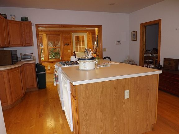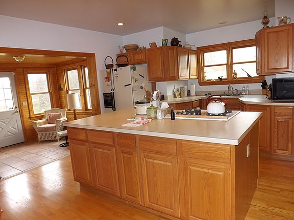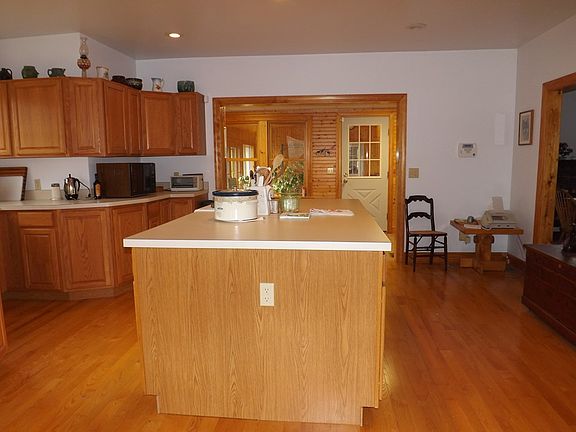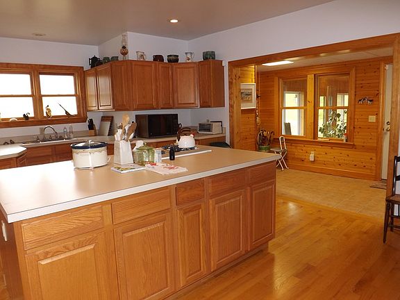 Spacious 3 bedroom/3 bath farmhouse, abundant oak cabinets and large center island in the kitchen, many windows for natural light, high ceilings, updated bathrooms, breezeway/sunroom with ceramic tile and a view opens onto a patio, attached three-bay garage with space for six vehicles and room to spare, located on 35+ acres just over a mile from town.