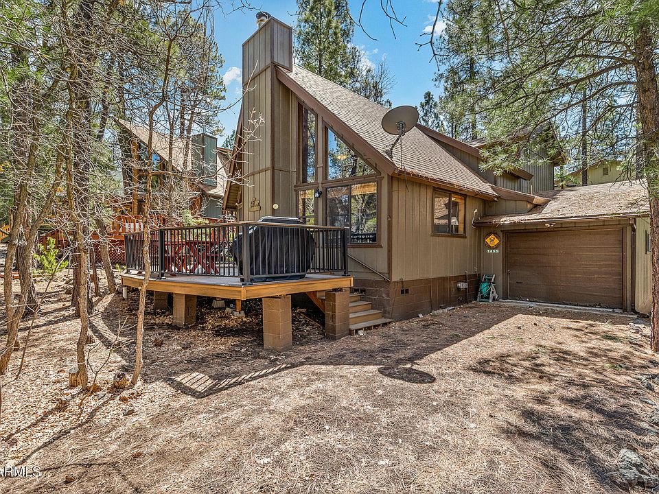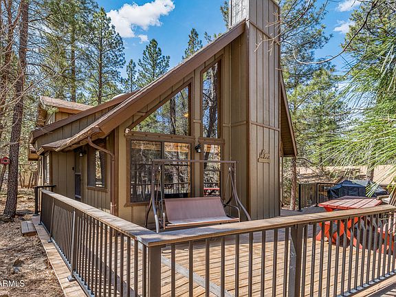 Nestled among towering pines and oaks, this stunning prow front chalet—one of the most sought-after home styles in Munds Park—sits in the highly desirable Animal Hill neighborhood. With its striking wall of windows and charming curb appeal, this home is an eye catcher. Step inside to an expansive great room featuring soaring tongue-and-groove ceilings, an open-concept layout, and a cozy wood-burning stove—perfect for gathering with family and friends. The adjoining dining nook flows seamlessly into the kitchen. The main level offers two comfortable bedrooms, a full bath, and a convenient laundry area. Upstairs, a spacious open loft provides flexibility as a guest sleeping area, reading retreat, or home office. The primary suite is spacious, complete with vaulted ceilings, an en-suite bath, and a generous walk-in closet. Additional highlights include a small garage for storing your outdoor toys, a wraparound Trex deck for enjoying the fresh mountain air, central heating and air conditioning, and the best part,it comes fully furnished!