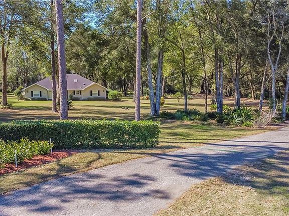 THIS IS THE LIFE! Come home and enjoy living in your own PRIVATE and PEACEFUL park-like setting with softly sloping hills, mature oaks, pines, and gentle breezes of fresh country air. Whether you work from home or commute, this will be your sanctuary where you'll be surrounded by the most beautiful and natural scenery and wildlife. This estate includes nearly 6 ACRES (5.8 Ac) trimmed with lush and MATURE LANDSCAPING supported with IRRIGATION. The home sits afar off from the PAVED country road, and the beautifully sculpted hedges that line the property serve as an attractive NATURAL BORDER that adds even more privacy. The spacious 3/2 home offers an OPEN CONCEPT layout with split bedrooms, a flex room that is currently used as an office, a covered front porch, and a SCREEN ENCLOSED BACK PATIO. The SOLID WOOD interior doors and trim throughout add some remarkable rustic character to the home! The open living space features a vaulted ceiling, laminate wood flooring, and a genuine, wood-burning STONE FIREPLACE. The well-appointed kitchen includes a complete appliance package, a CLOSET PANTRY, tons of cabinets, SOLID SURFACE COUNTERTOPS with an integrated sink, BREAKFAST BAR, a SKYLIGHT over the service area for added natural light, and a lovely view from the kitchen sink of the stretching and picturesque front yard! The owner's suite includes a WALK-IN CLOSET, full bathroom with a jetted GARDEN SOAKING TUB, separate shower, and a double vanity with DUAL SINKS. FRENCH DOORS open from the living room to the back patio where you can enjoy your morning coffee and take in the scenic view of the back acreage. This home also has a TRANSFER SWITCH INSTALLED for a PORTABLE GENERATOR that will convey, and the HVAC and refrigerator were just replaced in 2020. From the rear of the home, a BRICK PAVER WALKWAY leads to the DETACHED (2 Car) GARAGE which is oversized to include a WORKSHOP space. For added parking and storage, there are DOUBLE CARPORTS on each side of the garage, as well. AG Zoning on this property allows livestock, chickens, and more! I-75 is just 5 miles away, for a quick commute to Tampa. Properties like this are in high demand, so don't delay, call today to make it yours!