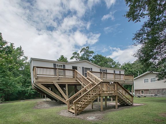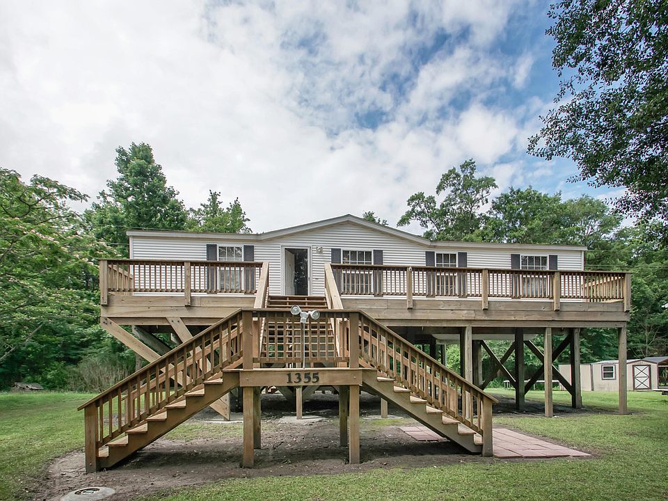Wonderful waterfront home in Holly Shelter Estates community in Burgaw, NC. Home features a split-open floorplan with three bedrooms, two full baths, and a spacious common area. Why settle for weekends on the river when you can be on these gorgeous banks full time?! 1355 Holly Shelter Estate Road in Burgaw is a manufactured home on stilts with private floating docks and access to the northeast Cape Fear. 1100+ sqft inside and over 0.5 acre outside gives you plenty of room to fish, entertain family and friends, and store your various watercrafts or RV. Home has been well kept, features front and rear wood decking, all just a few minutes' drive to daily shopping and dining conveniences in the city of Wilmington.