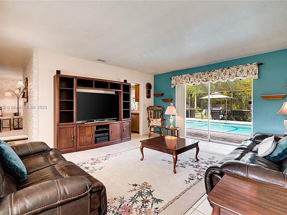 This 3 Bdrms/2Ba/2C-Gar/Pool-patio home is North of SW 136 St on SW 100 Ct. This home has all the floors on the same level! From the Foyer, 2 Bdrms and 1 bath are on the South side of the house and the Kitchen & Family area are in the middle with the Livingroom & Primary Bedroom & Bath are on the North side. Large Primary Bdrm (12 X 20) with Primary Bath opening to the Pool-Patio. The livingroom has 8’ sliding glass doors opening to the pool-patio with beautiful views of the pool-patio & the deep backyard. Large 2C-gar that has a work bench, electrical door opener & a freezer & refrigerator. The patio has plenty of entertaining space under cover as well as those who want the Sun! The kitchen has all SS appliances that are less than 1 year old. This is a wonderful home for all Generations!