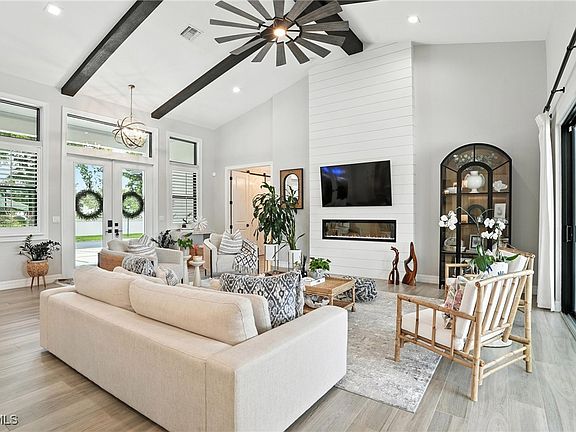 Boater’s Paradise in Catalpa Cove! This fully remodeled 4 bedroom, 3.5 bathroom residence blends timeless elegance with modern ease, thoughtfully designed for luxury, comfort, and effortless waterfront living—with no detail overlooked. Step inside to an open-concept layout with seamless flooring throughout. The swanky living room is both warm and sophisticated, featuring a custom electric fireplace, soaring ceilings, and exposed wood beams...a space for both relaxation and entertaining. The chef’s kitchen is a masterpiece, outfitted with top-of-the-line Thermador appliances, a grand island and a beautifully appointed coffee bar with a built-in Thermador coffee system, wine fridge, and beverage center. Designer wallpaper, elegant lighting, and upscale finishes elevate every space throughout the home. The primary suite is a true sanctuary, offering a spa-inspired bathroom with a steam shower and aromatherapy system, freestanding soaking tub, custom marble tile, Toto bidet toilet, and a dazzling Swarovski chandelier. The three guest bedrooms offer both comfort and versatility—one features an en-suite bath with direct pool access, another boasts a spacious en-suite of its own, and the third is adorned with elegant French doors. Outside, your private oasis awaits: a resurfaced saltwater heated pool and spa (2020), brand-new marble pool deck (2024), a convenient pool bath, and an outdoor shower. Just steps away, your deeded dock accommodates up to a 34-foot boat with a new 16,000LB lift, providing effortless access to open water adventures. Additional highlights include a new roof (December 2023) and all-new impact windows in addition to doors & sliders (2024). Located in the highly sought-after Catalpa Cove community, residents enjoy tennis and pickleball courts, a playground, clubhouse, industrial ice machine (perfect for boat days), and a fully gated, pet and golf cart friendly environment. This exquisite home doesn’t just offer the Southwest Florida lifestyle—it defines it! Call to schedule your private viewing of this home today.