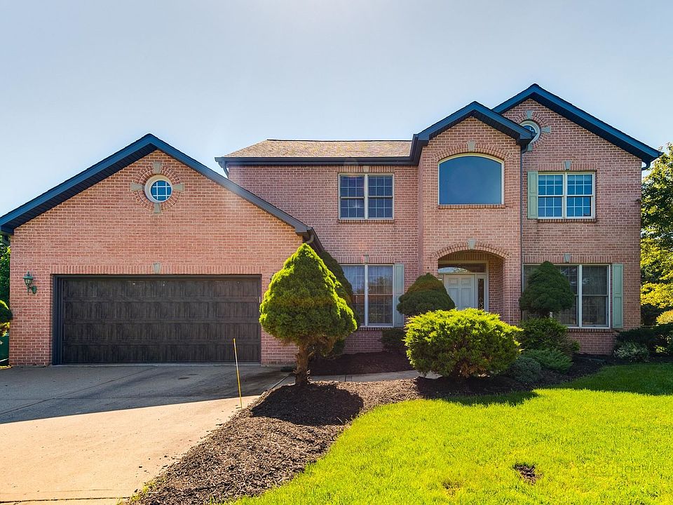 Charming 2 Story traditional Georgian located on very quiet cul de sac area in desirable River Ridge sub division. The brick front has keystone accents with vinyl siding and aluminum. Concrete driveway and patio in back with gas line at patio for outdoor grill connection. Nicely landscaped yard with backyard berm, the berm area is maintained by HOA. A fabulous cook's delight kitchen with large island, cabinets galore and open to huge family room. The rear den has hardwood floors. Master suite with 2 walks in closets. Whirlpool bath. Easy commute sub division. Newer roof, newer garage door, newer insulation added, newer dishwasher and oven. New painting thru out. 9' ceiling. Oak floors throughout foyer, dining room, kitchen, den and powder room. Six panel doors. 2 story foyers with crystal chandelier. Fully excavated huge space ideal for future finishings. Steam cleaned carpeting. Easy to show. Ready to move in!!!