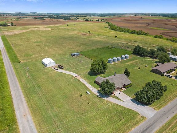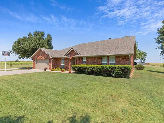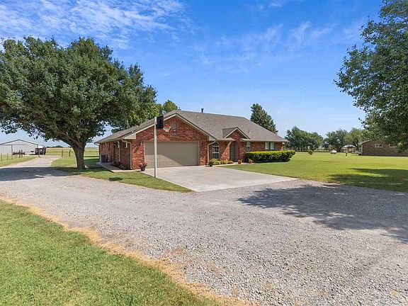Well maintained home on 2 1/2 acres with a 30' x 50' workshop. Workshop has plug for a generator and generator can stay with an acceptable offer. Home has approx. 2200 sq. ft. with 3 bedrooms, plus an office, 2 1/2 baths, and 2 car garage. Bedrooms are spacious with large closets. Floorplan is open living with corner fireplace. Kitchen has custom built oak cabinetry and beautiful granite countertops, breakfast bar, and stainless appliances. Recent improvements include: new roof/siding in 2017 (class 4 shingle), new luxury vinyl in the living and primary bedroom. Updated primary bath, powder room, and new granite throughout. HVAC new in 2020, tankless propane hot water heater, and garage door and opener is 4 years old. Dishwasher is 1 year old and range 5 years old. Seller has also replaced ceiling fans throughout and fresh interior paint. Home is well insulated and energy bills are affordable. Water softener is owned along with 500 gallon propane tank. Storm cellar in the backyard and security system in home. Give listing agent, Julie Bridges, Realtor with RE/MAX Professionals a call with any questions at 580-695-3883.
