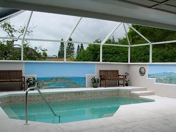 Move in ready pool home in the Gardens of Gulf Cove. 3 bedrooms, 3 baths - Remodeled with European style. Bedroom and bath 3 plus pool added in 2005. Unique and private courtyard spa/pool retreat has solar heat and tankless elec heat, powerful jets, waterfall, program color pool light and an outdoor shower. Updated kitchen with pass thru to lanai, tiled back splash, skylight. Master bath has bidet and towel warmer. Neutral ceramic tile floors except carpet in living room. Plantation shutters. 13' x 20' covered lanai area with 8' sliding patio POCKET DOORS - Can easily be closed in for even more living area. Front entry pergola. Mango and grapefruit trees. Curbed pebble garden area with pavers. One car garage is air conditioned with laundry, storage and work bench. Low annual HOA fee for Gardens of Gulf Cove amenities includes 2 community pools, tennis and secure RV Storage Lot. Activities offered include Aerobics, Aquacize, Arts & Crafts, Basketball, Bocce, Bowling, Bridge, Exercise, Chorus, Garden & Beautification Club, Horseshoes, Koffee Klatch, Poker, Shuffleboard. Just minutes to Englewood Beach and the Gulf of Mexico. MOTIVATED SELLER.