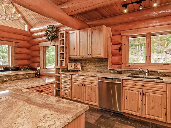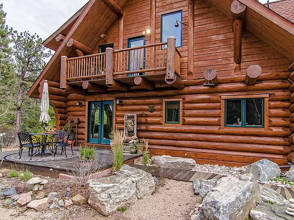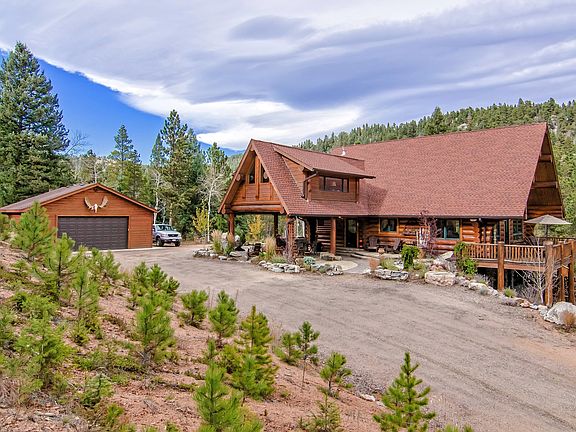 The Colorado Dream! What happens when Ralph Lauren and Paul Bunyan get together to make the perfect house? A spectacular, custom log home on 13+ acres of A2 zoned land backing to 80 acres of public land. This home will captivate your spirit and imagination with exposed logs throughout, an incredible prow of windows, the highest level of privacy and a kitchen designed for a chef. Boasting a new 642 SF garage and professionally landscaped with outdoor fire pit, grill and enormous outdoor, covered entertaining space with built in outdoor bar and grilling station in a lavish setting of stonework and flowing water. Sumptuous in floor heat radiates through slate and hand scraped wood. A large scale log stairway adds to the mountain atmosphere and the tongue and groove vaulted ceilings keep everything light and bright. Even has a Kohler 20KW backup generator.