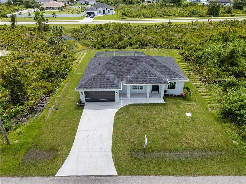Gorgeous new construction...Pool, Impact Windows...all high end finishes! Built to the highest standards and newest codes, you'll have no worries during ownership! Throughout this home you'll find millennium durable allergen-free porcelain plank flooring (a MUST in Florida with no need to replace carpet or laminate), luxury granite, solid wood soft closing with elegant handles doors & drawers cabinetry that has stepped placement (no blah evenly hung, straight across, zero personality in this house) with crown molding at their top, fully tiled showers (no plastic pans or inserts here), 5+ inch baseboards, upgraded full lighting package inclusive of ceiling fans in all bedrooms, living room & lanai! Need more, how about a large kitchen corner pantry, sliding glass doors for access to a custom pool and spa with glass accent tiling, sundeck, LED lighting, and 36 foot pool deck completely screened in for minimal pool maintenance?! Engineering wise, don't get fooled by builders who don't care what needs to be done here, this Floridian builder knows what has to be built in Southwest Florida for longevity and durability...hip roof design for long-term discounted insurance rates, off-ridge roof venting so peaks won't blow away, and STEM WALL construction which far exceeds monolithic slabs as sand can wash away but not cement blocks on footers! Builder is building out of the flood zone so this home when finished won't need flood insurance. Promise you will not be disappointed in this gorgeous, fabulously built paradise gem located in the amazing South Gulf Cove community!