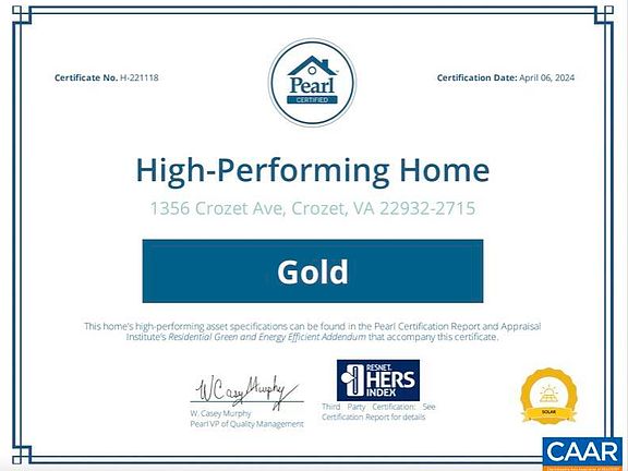 Live in Crozet without the restriction and additional costs of an HOA! Walk to everywhere - across the street to Crozet Elementary and next door to The Field School. You'll love being able to smell Crozet Pizza while listening to the sounds of the birds from your back porch. With a HERS 57 score, Pearl Certification, and solar panels, you'll enjoy low energy bills, plus a two car garage. The acre and a half of land gives you plenty of room to plant the garden of your dreams. Enjoy an open-concept layout, hardwood floors upstairs and down, sunny home office, and lots of thought put into upgraded details. The kitchen boasts stainless steel appliances, white cabinets, a large island, and leathered granite countertops. Storage abounds with extra closets, a walk in pantry, custom built-ins, and 1000+ square feet of unfinished basement! The basement includes a rough-in for a bathroom, full sized windows, and two exterior doors. Upstairs, the primary bedroom exudes convenience, with a large walk-in closet and adjustable blackout shades.The ensuite bathroom includes dual vanities, walk-in shower, and separate water closet for added privacy. You'll also enjoy a separate study area and a convenient second-floor laundry. See it today!