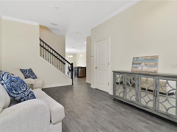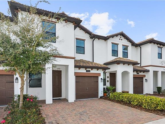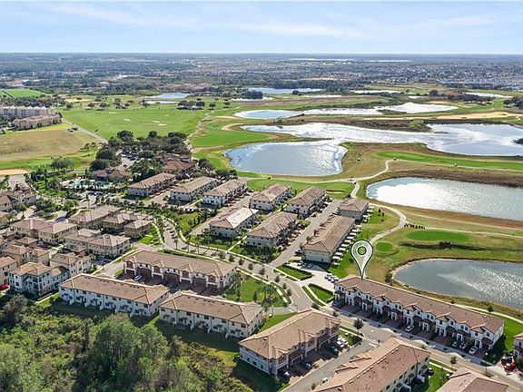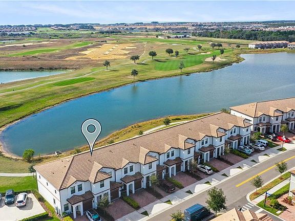 A beautiful, light-filled, waterfront and golf-front townhome featuring three spacious bedrooms, plus two and a half bathrooms. The stunning kitchen overlooks the great room and the dining room and is equipped with 42-inch wood cabinets, quartz counters and stainless steel appliances. There is a picturesque lanai that is perfect for relaxing outdoors and enjoying the views. Modern wood-look tiles throughout the main floor and ceiling fans were installed in all of the bedrooms and family room. The master bedroom features a tray ceiling and an extra-large walk-in closet that has been upgraded with custom cabinetry. Dual sinks in the master bath with walk-in shower. Washer and dryer are conveniently located on the second floor. Located adjacent to The Omni's Golf Club, this amazing community offers two nationally-recognized, Greg Norman-designed golf courses. Take advantage of 54 holes of signature golf, starting just steps from your home. In addition, there are an array of amenities for you to enjoy at the Oasis Club and Vistas Clubhouse including a resort-style pool with a huge lazy river and a 2-story waterslide, splash zone, fitness center, movie theatre, game room, golf simulator, volleyball and tennis courts, and more. Best of all, the community offers maintenance-free living. The HOA includes basic cable, phone, internet, lawn, valet trash service, exterior paint and pest control and a gated main entrance. Prime location with shops and restaurants nearby, Champions Gate is minutes away from Walt Disney World and I-4 with easy access to Orlando International Airport.
