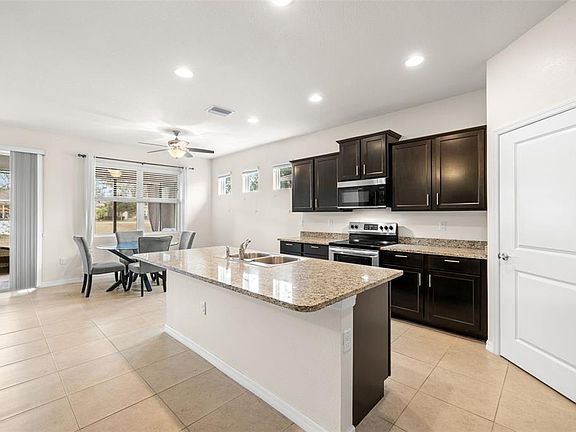 Welcome Home to the gated community of Villages of Avalon, where pride of ownership is felt from the moment you arrive. Built in 2018 and beautifully maintained, this 4 bedroom 2 bathroom home offers nearly 2,100 square feet of living space that still feels brand new. The low maintenance curb appeal is made even easier with lawn care included through the HOA which allows you more time to enjoy the lifestyle this community offers. A screened front entry welcomes you inside to an inviting open concept floorplan with high ceilings that create a bright and spacious atmosphere. The heart of the home is the well-appointed kitchen complete with granite countertops, espresso cabinetry, stainless steel appliances, a large corner pantry and an impressive 7 foot island that provides generous barstool seating. The living room features a wall mount TV frame that will remain for the new owners to enjoy. A split bedroom layout places the owner’s suite on its own side of the home for privacy. The spacious suite includes double walk-in closets and an ensuite bathroom with dual granite-topped sinks, a glass enclosed stand-up shower and a separate water closet. Tile flooring runs throughout the main living areas, while the bedrooms offer plush neutral carpet. Additional features include an interior laundry room, and blinds and window treatments on every window. Step outside to the screened-in lanai where you can relax and unwind under two ceiling fans with outdoor curtains to add shade and privacy. The home also includes a sprinkler system and solar panels for energy efficiency. The community offers fantastic amenities including a clubhouse, pool, fitness center and picnic area with tables. With low HOA fees, no CDD and no flood insurance required, this is truly easy Florida living at its best. Villages of Avalon places you near everything you love. Enjoy quick access to the Suncoast Bike Trail, Anderson Snow Park and Splash Pad, a full shopping center, and the Veterans Expressway for an effortless commute to Tampa. Tampa General Hospital’s Spring Hill location sits just minutes away, offering peace of mind whenever you need it. Sweetfields Farm is only a quick ten-minute drive for wandering sunflower fields in the spring and enjoying their beloved fall festival each year. Life here feels delightfully small-town in all the best ways, yet you’re still perfectly connected to every convenience, recreation spot, and commuter route you rely on. Come experience it for yourself and schedule your showing today!