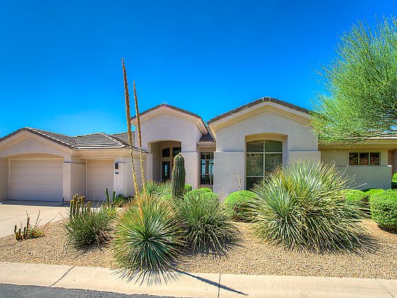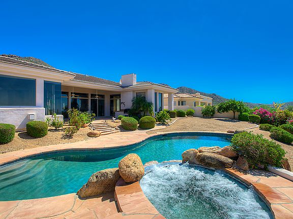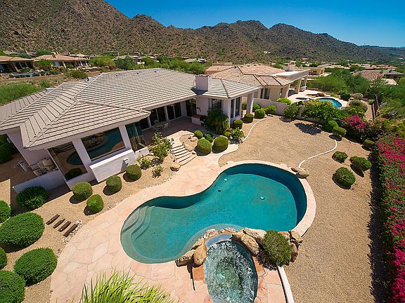 Elevated VIEWS, VIEWS, VIEWS from this immaculate home located in guard gated Scottsdale Mountain. You will love the mountain views during the day and stunning twinkling city lights at night. Resort style yard is perfect for entertaining and features a pebble heated pool with spa and built-in BBQ. Chef's kitchen with granite counters, gas stovetop, large breakfast nook and convection microwave oven. Master bedroom has a large walk-in closet with built-ins and dresser island. Ceramic tile wood floors throughout out great room, all three bedrooms and dining room. Large wet bar with a built-in mini fridge. This home is perfect as a full-time residence or as a vacation home. All furniture and accessories are negotiable with a few exclusions. This home is a must see!