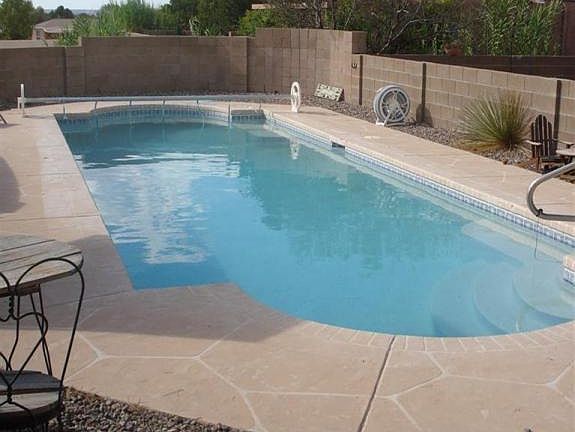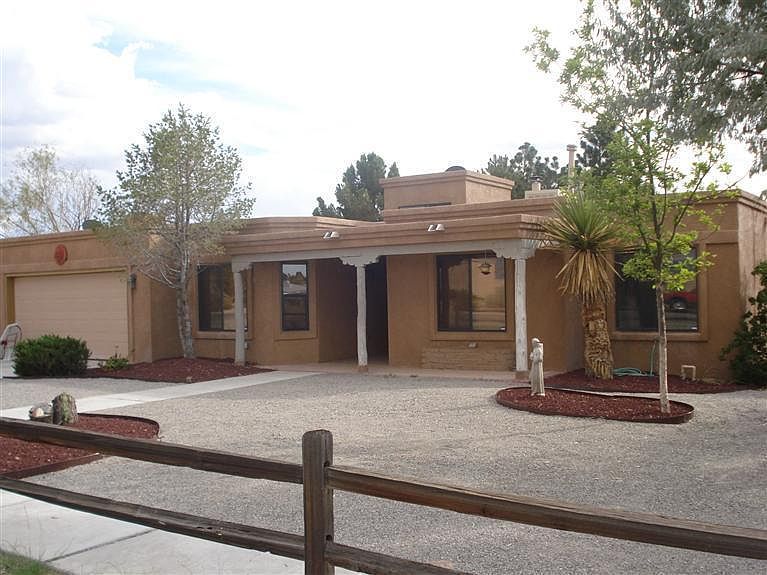 Tenant occupied! Much privacy in this updated, 4 BR, 2 BA, SW style home, featuring a fenced, inground gunite pool, all on a 1/2 acre lot! The separate Master BR opens through a private door to the lovely screened in porch which is just footsteps away from the pool. Take in the New Mexico blue sky views from just about anywhere on the lot. Many features including evergreens, cellular alarm system, laminate flooring, gas log fireplace, nichos, skylights, block fencing.Come and see!