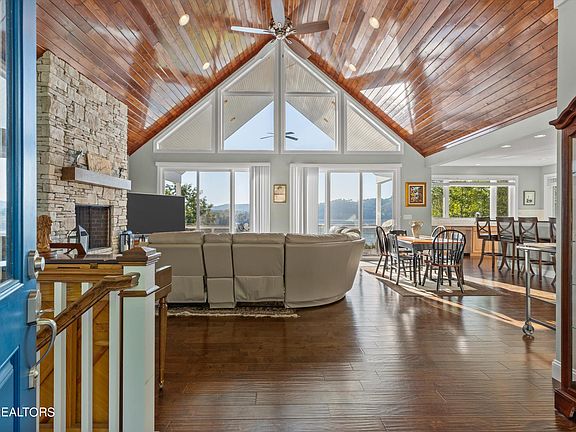Spectacular Views, Breathtaking Sunrises, and Year Round Deep Water on Norris Lake! You will love this custom built 5BR/3Full Bath and 2 Half Bath home. Located in the beautiful Norris Shores neighborhood, this lakefront home is a must see! Fantastic custom kitchen with double oven, quartz and premium marble counter tops, marble stone backsplash, Custom Maple cabinets, and new GE Profile refrigerator. The large doors and windows provide breathtaking views of the lake and mountains from almost every room and provide great natural light through out this wonderful home! The home features an open floor plan and plenty of room for entertaining. The main level includes an oversized kitchen with a large island, a large great room with stone fireplace, the main bedroom suite, half bath, laundry room, oversized 2 car garage, and a large covered deck with panoramic views of the lake and islands. The basement includes a large rec room, 2 sets of Jack and Jill bedrooms, another large covered deck over looking the lake, and a half bath. The property has a large 2 car garage, home has both a concrete cart path or