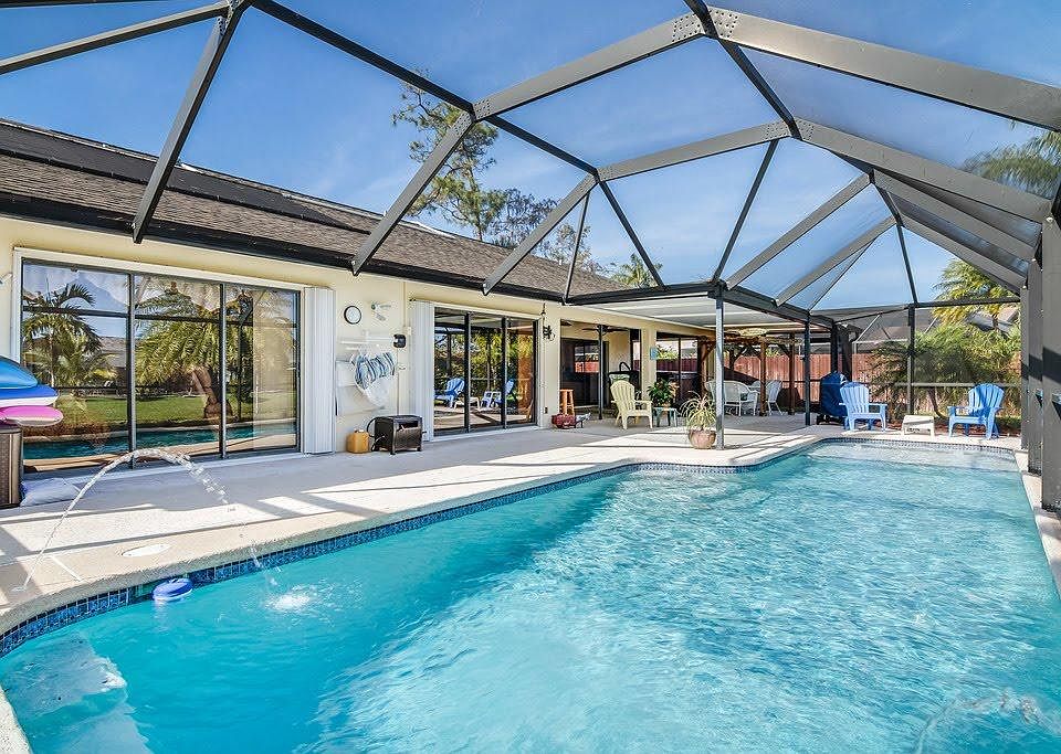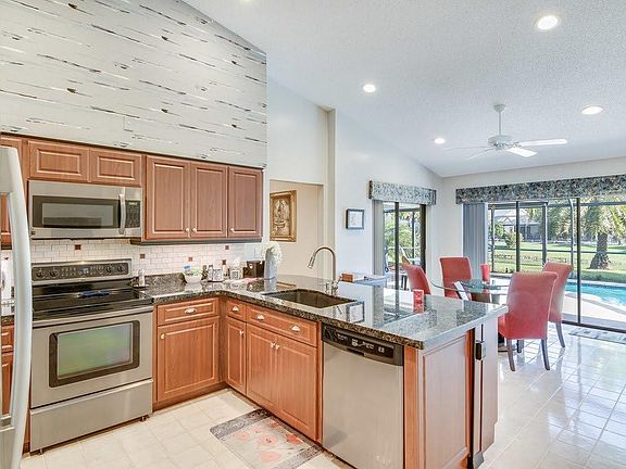 Great 3 bedroom, 2 bath family home in Sugar pond has EVERYTHING! As you enter, you see the soaring, vaulted ceilings in the living room and the inviting gas fireplace on the wall. Living room sliders open completely to the Key West Style pool/patio area with spa and covered area. Pool is salt water and heated by solar panels with a thermal cover. Eat-in kitchen is totally remodeled with long, cherry cabinets, granite counter tops and custom built-in double ovens!Living areas and the master bedroom have wood laminate flooring, other bedrooms have carpet. Whole house is wired for sound and has security cameras throughout for safety. The owner has thought of every detail to make this house a home--he even put flooring in the attic!