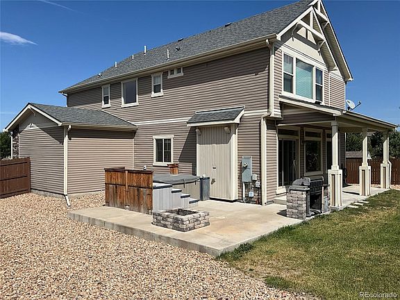 Outside, the .20-acre backyard is perfect for relaxing or entertaining. It features a covered patio, raised garden beds, a built-in grill, a firepit, and a hot tub that stays with the home.