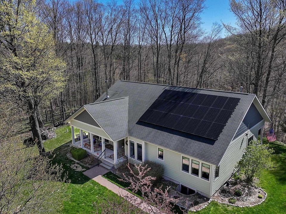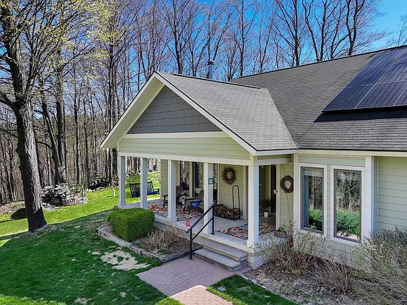 If you’re seeking tranquility and a peaceful state of mind, look no further. This stunning residence is surrounded by 3.5 wooded acres perfectly placed on a picturesque hillside. Thoughtfully placed windows in the lovely 4 bedroom, 3 bath house bring the beauty of the land inside. Nature abounds! Custom built in 1998 with 3,478 finished sq. ft. the home is ideal for main level living for all ages. Updates in 2013 and 2021 include a delightful sunroom, remodeled kitchen & baths, spacious lower level family room, work-out room, 4th bedroom & full bath, finished area above the detached 2 car garage and solar panels on the roof. Location is minutes from Lake Michigan public beach in Empire and all that the Sleeping Bear National Lakeshore has to offer.