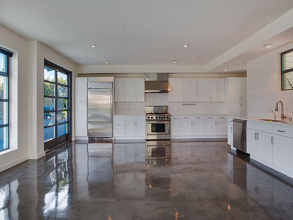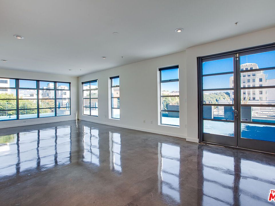 Private entry courtyardContemporary penthouseModern architectural designHuge wrap-around private patioHigh beamed ceilingsSleek white quartz countertopsWalk-in closets