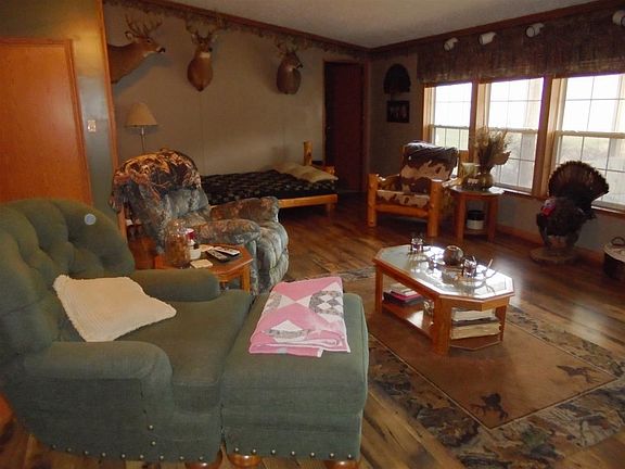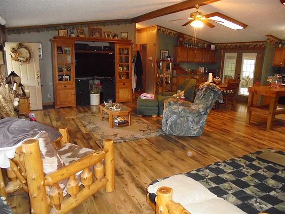 Open, split bedroom floorplan with vaulted gr room, kitch and dining. Master suite features a custom bath with 5x5 ceramic tile shower. On the exterior, a covered front porch and rear deck running the entire length of the home, approx. 3000 sqft of garage space., with electric, water & concrete floors. This home is equipped with an outdoor wood furnace that provides an alternate heat source.
