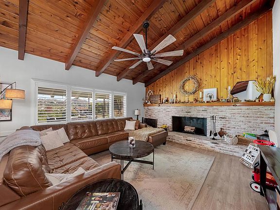 Discover cozy, rustic charm in this highly upgraded, single-level traditional farmhouse-style home, thoughtfully designed with the low-profile layout of a classic ranch home in a great neighborhood. Exposed wood-beamed vaulted ceilings and custom finished brick accents in both the living room and kitchen create a warm, inviting atmosphere that highlights the home’s rustic character. Step outside to take in the property’s beautiful panoramic views and enjoy an entertainer’s yard featuring a built-in smoker & Blackstone grill, covered dining area, firepit, and a fully fenced yard and vinyl fencing around the property. Additional highlights include spacious rooms, laminate flooring, a circular driveway, paid solar, newer heating & air, and newer windows—blending timeless charm with modern comfort and efficiency. Don’t miss the opportunity to make this beautifully crafted home your own.