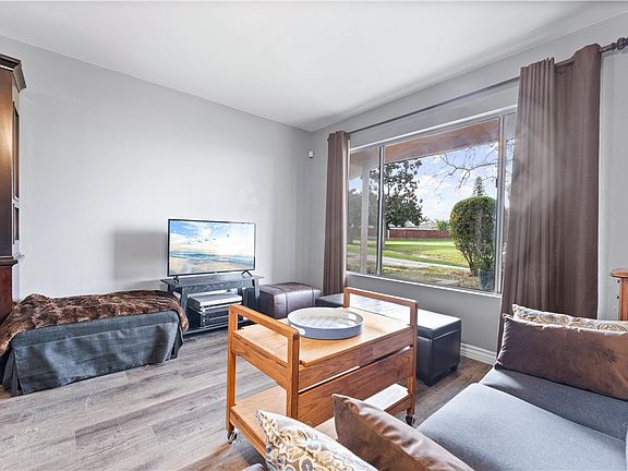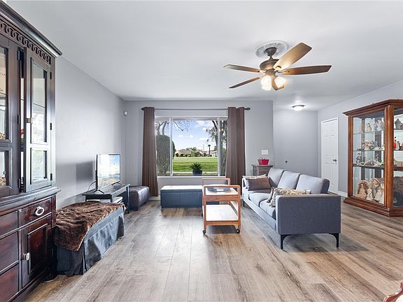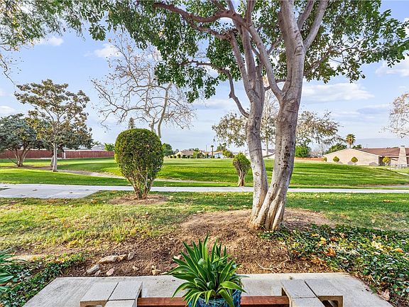 This condo has an amazing view ! It's single story, ground level, with nobody above or below. It has an open concept floor plan featuring newer wood laminate flooring throughout. From the main area you can enjoy picturesque views of the greenbelt. Step out the sliding glass door, adjacent to the dining area and updated kitchen, to relax or dine al fresco in the private patio, surrounded by newer vinyl fencing and a gate. Down the hall is a full bath with tile floor, two spacious bedrooms with ceiling fans and a newer closet organizer in the primary bedroom, which also has an amazing view ! This desirable condo includes a single car garage and a designated parking space just steps away. A secure laundry room is shared with the other 3 units. Village Grove HOA includes: Water, Trash, outside maintenance and so many amenities: a lake with paddle boats, fish & a beach . . . a swimming pool . . . a park with play equipment, a pavilion, BBQ's, picnic benches, tennis courts, a volleyball court & a basketball court. Village Grove Community is West of the Corona circle and close to grocery, fitness, shopping, restaurants, schools and approx 5 minutes from the 91 freeway. This complex is FHA approved. Come see for yourself !