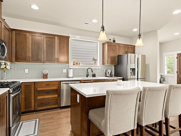 Step into the well-appointed kitchen and discover a chef's delight with a convenient gas range, stainless steel microwave, refrigerator, and dishwasher.