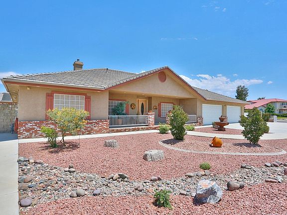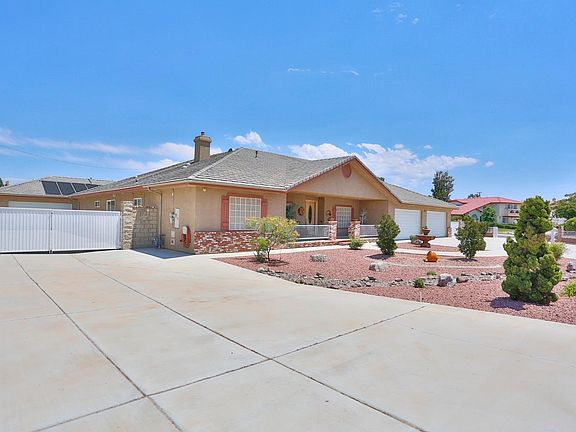 Seeing is believing! This 4 bedroom Apple Valley pool home proudly stands apart from the rest. As soon as you walk in on the all brick and hardwood flooring to the enormous kitchen with triple sinks, complete bar with hand crafted knotty hickory through out this beauty, you will be amazed. Very open Split floor plan with lots of windows viewing out to the patio and pool. Detached casita with kitchen and full bathroom. 4 car attached garage with a 2 car detached shop/garage. Corian counters through out, even in the showers, wood shutters cover all the windows. Master suite offers a jetted tub and his and her vanities. Block wall and iron fencing for privacy. Hidden screens on all doors leading outside. So much concrete for RV parking and long drive way to the work shop in the back. This home offers so many extras you have to see to believe.