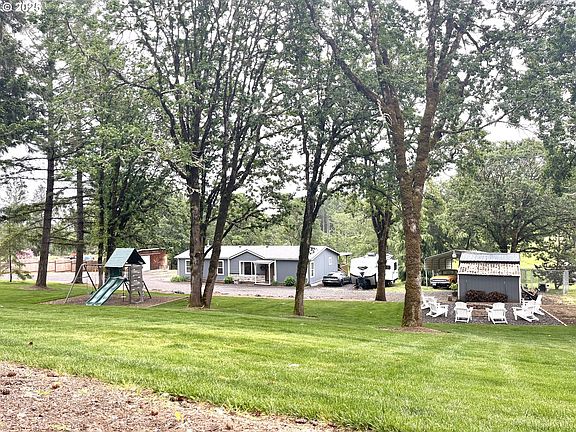 Nestled on 9.61 park-like acres just 6 minutes west of Yamhill, this well-maintained 3-bedroom, 2-bathroom manufactured home offers the perfect blend of tranquility and convenience. With 1,512 square feet of living space, an open floor plan, and a cozy wood-burning stove, this home provides a comfortable and inviting atmosphere for you and your family. The expansive 56x12 foot covered deck, located just off the kitchen, is ideal for BBQ enthusiasts, offering a serene backdrop of private and expansive pastures. As the sun sets, move to the front of the house to watch the herd of deer that frequently visits the property, and enjoy stargazing while staying warm by the fire pit. The property features a recently completed landscaping project, including rock retaining walls, a fire pit, spigots and an irrigation system, enhancing the natural beauty of the surroundings. Additionally, a large garden shed with water and a small barn with an attached chicken run and a coop with 3 nesting boxes and ~6 fenced acres of pasture. There is plenty of parking space to accommodate your vehicles and equipment. The upper NW portion of the property has been excavated, offering a blank canvas for a riding arena, stable, shop, or hobby farm barn, with endless possibilities for outdoor enthusiasts and those looking to bring their own vision to life. With paved road access, no HOA fees, a private well and septic system, an energy-efficient heat pump and wood stove, and extremely low taxes, this unique property keeps ownership costs low. Don't miss out on the opportunity to own this beautiful piece of land with a charming home.