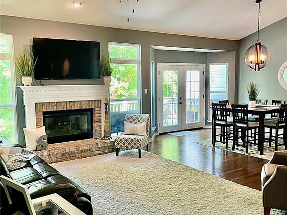 Spacious updated villa that backs to woods in the popular Pine Bluff Villa's Subdivision. This home features approx 2700 sq ft of finished living space. Soaring vaulted ceilings and beautiful hardwood flooring flow throughout the entire main floor living area. The formal dining room opens to the great room that features a gas fireplace, plenty of natural light, and continues into the breakfast nook and updated kitchen with 42"cabinets, granite counters, updated appliances, Blanco sink, and custom faucet. The large primary suite is bright and inviting, with a full bathroom and large walk-in closet. A guest room and updated guest bath complete the main floor. Once you descend the stairs to the lower level, you'll find a large family room perfect for entertaining, a gas fireplace, full bathroom, play room, and 3rd bedroom. The abundance of windows and the walkout provide plenty of natural light. Enjoy privacy and views of wildlife from the deck. Great location, close to major interstates. Being sold by owner/agent.