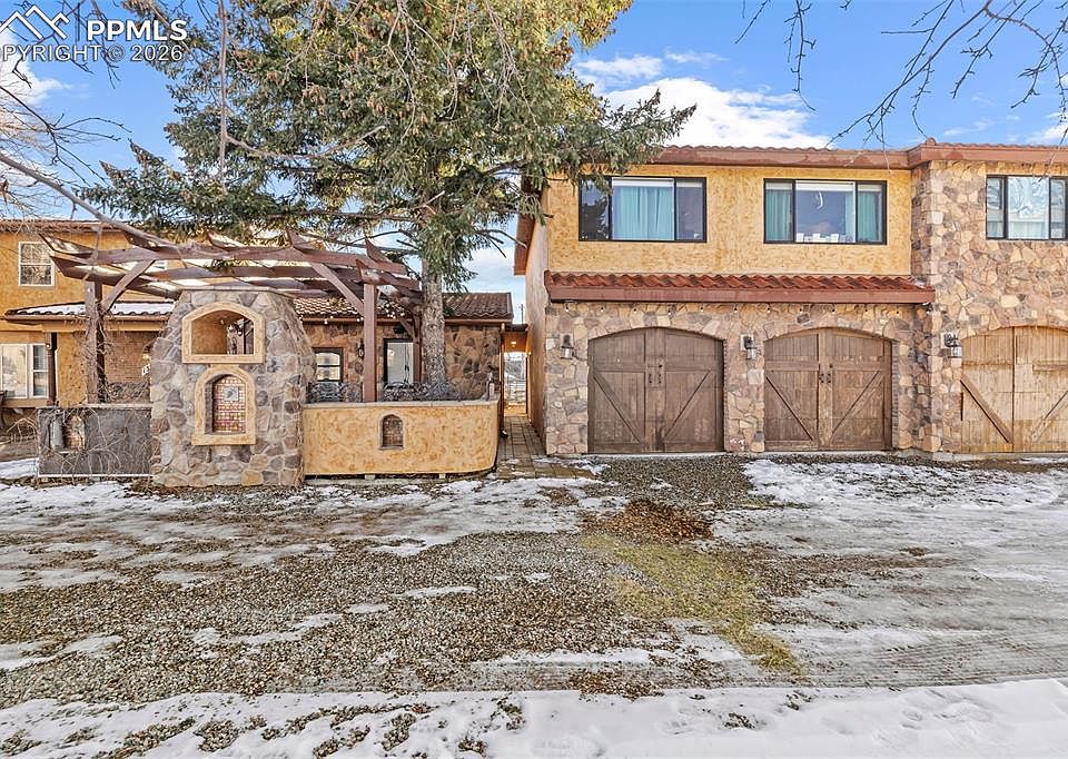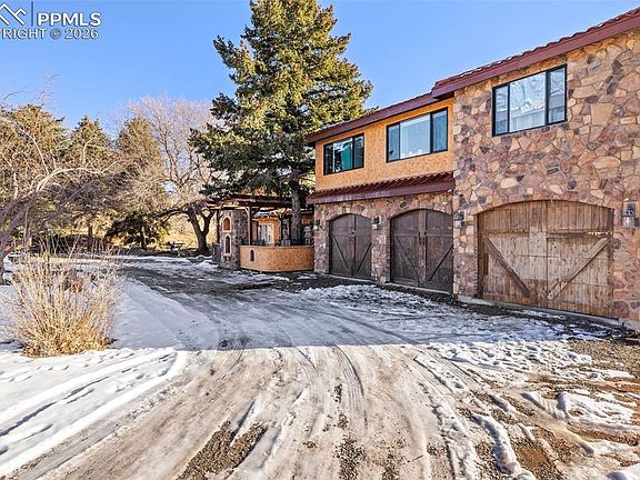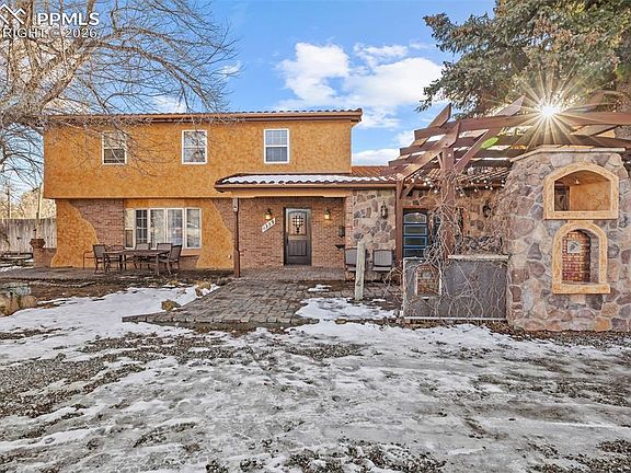 Opportunities like this are increasingly rare. Located in the heart of Colorado Springs, this property offers the unique combination of a little over 1 acre of usable, fully fenced land with the convenience of being just minutes from major shopping, dining, and everyday amenities. The setting feels private and rural, yet remains firmly connected to city living. The property includes a main residence as well as a separate apartment with distinctive Mediterranean-inspired character, featuring multiple living spaces, a formal dining room, kitchen, flex room, and a large primary suite with a private sitting area. A wood stove with a stone fireplace anchors the home, adding warmth and character. The basement includes additional space with cedar-lined walls, offering flexibility for future use or customization. A three-car garage includes additional living space above it with a separate entrance, kitchen, living area, bedroom, bathroom, and laundry — ideal for guests or extended living arrangements. The land itself is a standout feature. It is relatively flat, fully fenced, and complemented by a greenhouse and detached covered structures currently suited for storage or hobby use. This is a property that invites vision whether restoring, updating, or reimagining to suit your needs. While the home requires some updates and improvements, and the existing septic system will likely need replacement this home offers a lot of potential. For buyers who value location, land, and potential over cosmetic perfection, this is a rare chance to secure acreage in the middle of town and create something truly special.
