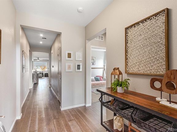 Welcome to this beautiful three bedroom ranch home featuring one level living at its finest. Upgrades include a gourmet kitchen with five burner gas stove, granite island, pantry, & subway tile backsplash. Plank wood flooring throughout all high traffic areas help to keep this home looking new. Spacious primary bedroom features a large bathroom, beautifully tiled shower and walk in closet. Built by Meritage means this home is more energy efficient and upgraded than the neighboring homes, including on demand hot water, whole home humidifier and many smart features that you can manage from the convenience of your phone. Oversized garage, its more like a 2.5 car garage. You will enjoy relaxing or entertaining on the covered patio overlooking the green belt. Convenient location, centered between downtown Denver and Boulder. The commute to DIA is about 25 minutes and you can get out to go shopping, dining, get to the Children's Hospital in minutes, and we cannot overlook the proximity to the park and many walking trails. This is one you don't want to miss!