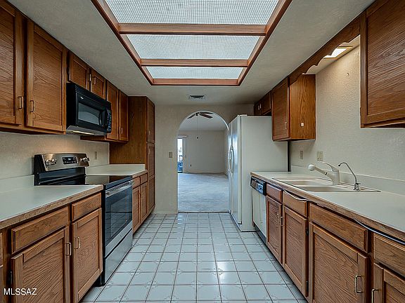* Open and airy 2 Bd/2 Ba plus den/flex room Santa Fe style - Ensenada Model located on Camino de la Oca (Goose Road) in Canoa Hills Townhomes community of Green Valley. This home features spectacular South-West facing views from the back patio of the Santa Rita Mtns and Elephant Head, on down to Nogales, and overlooks a natural desert arroyo and the former Canoa Hills golf course with plenty of walking pathways. Galley style kitchen with skylight, eat-in breakfast area and Laundry closet behind bi-fold doors. Living Room/Dining Room with slider door to patio and mini bar with sink behind French doors. Master Bedroom highlights slider door to patio. Master Bathroom with skylight and shower. Master Walk-in Closet with skylight. Guest bathroom with skylight and tub/shower.