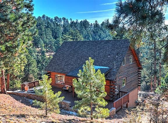 Beautiful log home with spectacular mountain views! This 5.3 acre property is only minutes to Highway 285 yet feels secluded with a thickly treed lot and lovely front porch boasting a gas fire pit to enjoy Colorado outdoor evenings. This home has a deck to enjoy the mountain views along with a 2200 square ft interior with views from most windows of the spectacular scenery. This cabin is cozy and has beautiful wood accents throughout the home to include log rails, tongue and groove vaulted ceilings and hardwood floors. One bedroom is on the upper level, while two more are on the lower level.