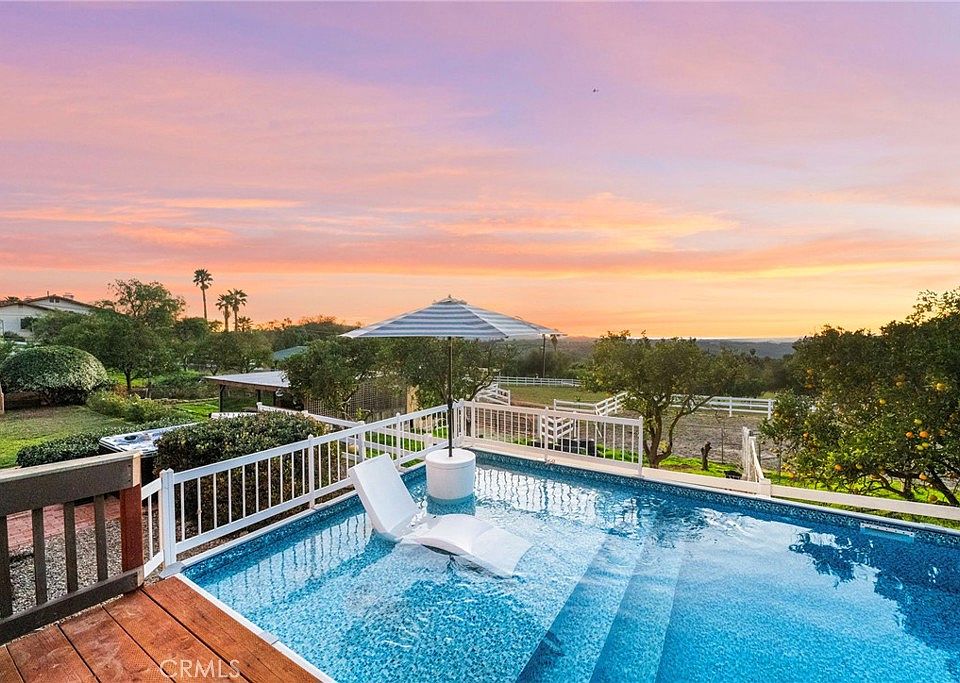 Welcome to this beautifully upgraded 5-bedroom, 4-bath home set on 2.64 acres in the highly sought-after community of Valley Center, California. Offering the perfect blend of modern finishes and country-style privacy, this property is ideal for those seeking space, comfort, and lifestyle freedom—complete with no HOA, low taxes, fully paid-off solar, and two Tesla batteries that provide backup power during outages to keep the home running seamlessly. The manicured orange orchard and welcoming façade set the tone from the moment you arrive. Inside, a spacious front room provides the perfect setting for entertaining family and friends. The open, thoughtfully designed floor plan flows seamlessly, creating an inviting atmosphere for gatherings both indoors and out. The kitchen features warm honey-maple cabinetry paired with granite countertops and ample storage, while the adjacent formal dining area is generously sized—perfect for hosting memorable dinners and celebrations. The main residence offers four well-appointed bedrooms, each providing comfort and space. The first floor includes a bedroom and full bathroom with a shower, ideal for guests, multi-generational living, or a private suite. The primary retreat serves as a true sanctuary, complete with a luxurious en-suite bathroom designed for relaxation. Adding exceptional versatility, the property includes an attached guest house with one bedroom and one bathroom—perfect for extended family, visiting guests, or added flexibility. Step outside to an expansive backyard that will impress any equestrian enthusiast, featuring a horse arena with built-in drainage, a fully maintained barn, and Buckley fencing designed specifically for horses. Beyond its equestrian appeal, the outdoor space also serves as a private oasis—ideal for family barbecues, outdoor games, or simply enjoying the Southern California sunshine in your pool. Multiple access points provide easy road access and convenient connectivity to nearby horse trails. With its strong sense of community, well-kept surroundings, and meticulously considered details, this property seamlessly blends comfort, functionality, and the joys of both family living and an equestrian lifestyle. Don’t miss this extraordinary opportunity—schedule your private showing today.