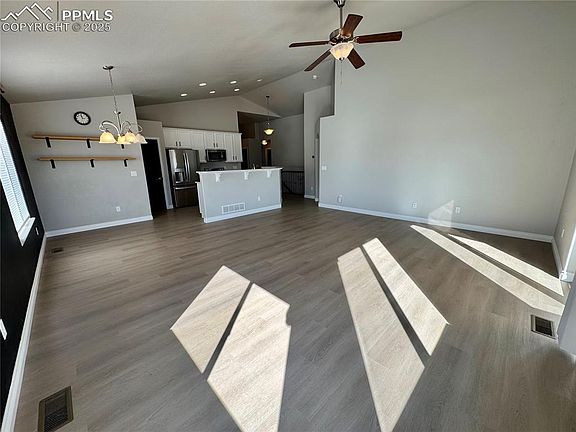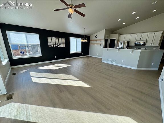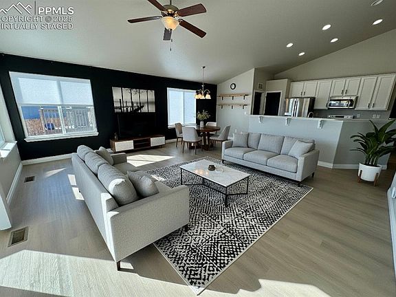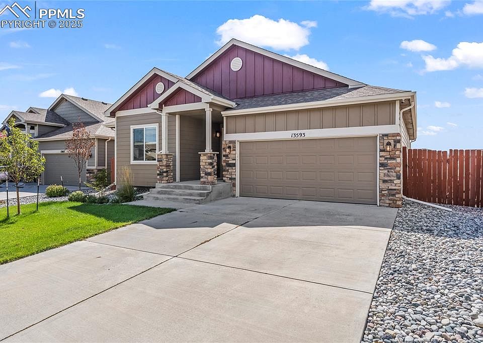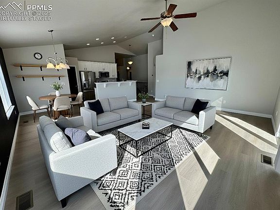 Welcome to this meticulously maintained ranch-style home in the desirable Meridian Ranch community, offering easy access to parks, trails, recreation centers, schools, restaurants, shopping, and nearby military bases including Peterson, Schriever, and the Air Force Academy. Inside, you’ll find an inviting open-concept layout with vaulted ceilings, brand new vynil plank flooring, and new carpet throughout. The main level features a spacious primary suite with a luxurious 5-piece bath and walk-in closet, along with two additional bedrooms, a full bath, and a convenient laundry room. The kitchen is beautifully appointed with quartz countertops, stainless steel appliances, and an electric range with a gas line already available. The huge finished garden-level basement provides abundant storage, an open bonus room, two additional bedrooms, and a full bath—perfect for guests or a home office. Outside, enjoy the low-maintenance xeriscaped backyard with synthetic turf, a Trex deck for entertaining, and level terrain ideal for year-round enjoyment. Walk to the local high school and take advantage of a location that combines comfort, convenience, and community living in one of Colorado Springs’ most sought-after neighborhoods.