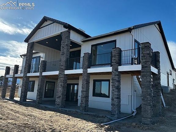 Grandview ranch plan in Flying Horse. Farmhouse style exterior with tile roof. 5 bedroom, 4 bath home. Attached 3 car garage and additional 3 car detached garage. The main level showcases a great room with 12' ceilings and fireplace, large dining nook and 12' wide sliding glass doors which lead out to a large covered deck with a gas line. Gourmet layout kitchen features pantry, large island, JennAir stainless steel appliances including a dual fuel range, and sophisticated Quartz countertops. Ceilings beams in the kitchen serve to define and enhance the space. Walking through the garage owner's entry there is a mud bench with cubbies and separate laundry room. Home comes equipped with a energy efficient blown insulation package and active radon mitigation system. Spacious master retreat features a large walk-in closet, a free standing tub, double sinks, and shower with seat and sleek frameless shower surround. The walkout basement features a rec room with wet bar and fireplace. There are 3 bedrooms in the basement, all with walk-in closets. The largest bedroom has its own private bath.