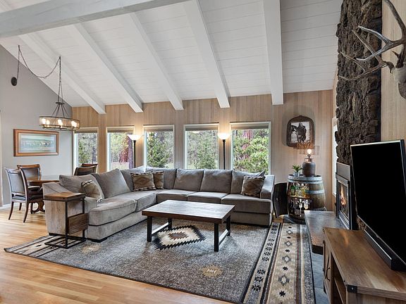 Resort living in the serene South Meadow of Black Butte Ranch. This 3-bedroom, 2-bathroom home has 1708 sq ft of living space, featuring a soaring two-story vaulted ceiling and exposed beams that enhance its rustic charm. Expansive windows flood the home with natural light, creating a warm and inviting atmosphere. The kitchen features granite countertops and newer stainless steel appliances, perfect for the home chef. The upper floor has a versatile loft perfect for an office or extra sleeping space. A spacious laundry/mudroom offers easy access from the expansive deck. The deck with a new hot tub is ideal for entertaining or unwinding under the stars. The home sits on over half an acre, filled with mature pines that provide a natural setting and ample privacy. Big, 2 car garage with storage for all the gear. Located just a stone's throw from the South Meadow Pool, tennis courts, and bike trails. A perfect base for all the outdoor activities on the ranch.