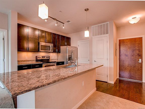 Smile, You're Home! This is the one you've been waiting for! Perfectly situated in a fantastic community with amazing amenities, including; pool, clubhouse, work out facilities, hot tub, parks and open space + secure under ground parking, secure building and elevator. From you're private balcony, you'll enjoy some mountain views and plenty of space for grill and space to relax. Inside boasts excellent finishes with a spacious kitchen, complete with island, 42" cabinetry, pantry, farm sink, granite counter tops, hardwood floors and stainless appliances. Additional features include; 2 master suites, washer & dryer included and brand new carpeting. In the secure garage, there is one reserved parking space and storage unit included. As with all homes in this community - this condo won't last long! Make sure it is on your list to see this weekend~
