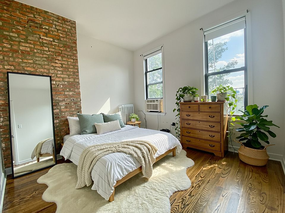 hardwood floors, tall ceilings, exposed brick, bedrooms on opposite sides of the unit,