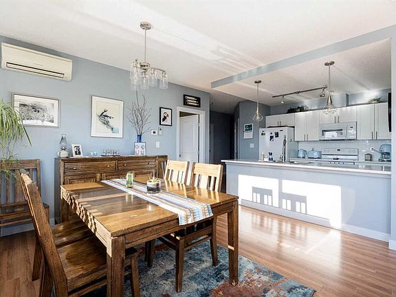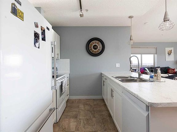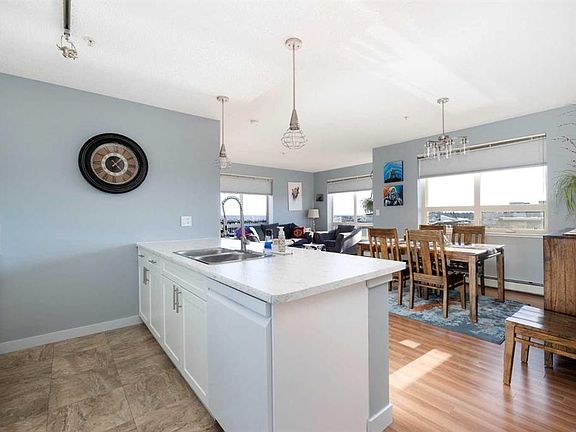 Experience the pinnacle of condo living in this stunning top-floor penthouse at The Peaks at Eagle Ridge. This rare and sought-after corner unit offers exceptional privacy, breathtaking panoramic views, and a refined, low-maintenance lifestyle in one of Fort McMurray’s most desirable communities. With two spacious bedrooms, two bathrooms, and two private patios—one complete with elegant cast aluminum furnishings and a natural gas hookup—this home is thoughtfully designed for comfort, convenience, and elegance. Step into a bright and airy open-concept layout enhanced by elevated 9-foot ceilings that add a sense of grandeur and openness throughout. These ceilings not only increase the feeling of space but also allow for better light flow and airiness, making the home feel even more expansive and inviting. Expansive windows flood the interior with natural light and perfectly frame the sweeping views of the surrounding landscape. The modern galley-style kitchen features upgraded countertops, a stylish backsplash, newer appliances, pantry, and an eat-up breakfast bar—ideal for casual dining or entertaining. The generous primary bedroom includes a walk-through closet and a private ensuite, while the second bedroom offers ample space and direct access to the main bathroom, making it ideal for guests or a home office. In-suite laundry with an upgraded washer and dryer adds to the everyday convenience. Refined features throughout the unit include stunning engineered hardwood flooring, custom blinds, newer paint, updated lighting, and the recently installed Telus Fibre Optic service for high-speed internet. Enjoy year-round comfort with air conditioning and a gas BBQ hookup and step out onto either of the two private patios facing east and south to relax or entertain while taking in the panoramic views. Built with concrete construction, the building offers superior soundproofing and enhanced peace of mind with secure access and restricted floor entry. Residents of The Peaks enjoy a wide range of amenities, including two fitness rooms, a social lounge, games room, children’s playground, car wash bay in the underground parkade, pop up access from parkade to bus stops and is pet friendly. Comes with one secure underground parking stall with a storage locker # 206 and one conveniently located energized surface stall #229. Located just steps from the Birchwood Trails, serene ponds, walking paths, shopping, dining, schools and Landmark Cinemas, and quick connected access to Stoney Creek. This home seamlessly blends natural beauty with urban convenience. This exceptional penthouse is truly one of a kind—luxurious, private, and maintenance-free, with unmatched views and lifestyle amenities. Don’t miss the opportunity to call this elevated retreat your home.